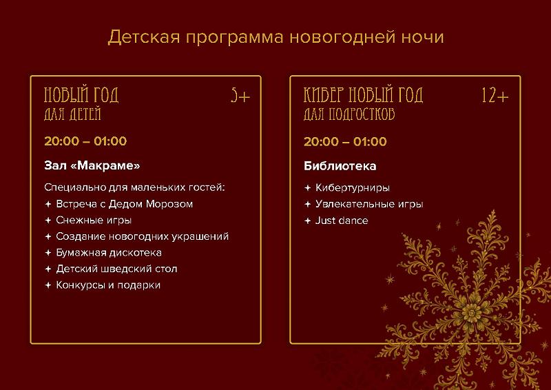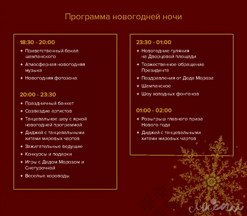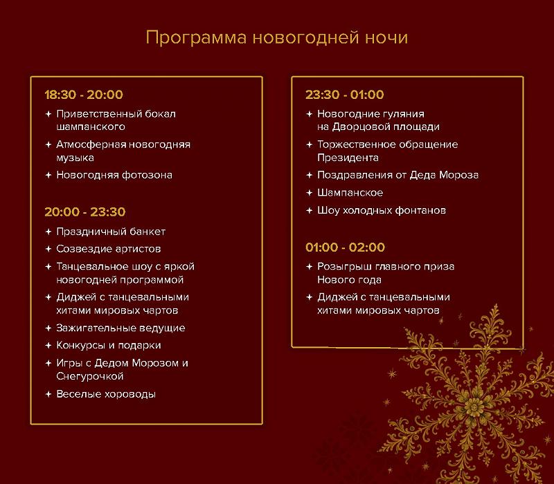 Стоимость новогоднего банкета 20000 руб./чел. в зале Таврический